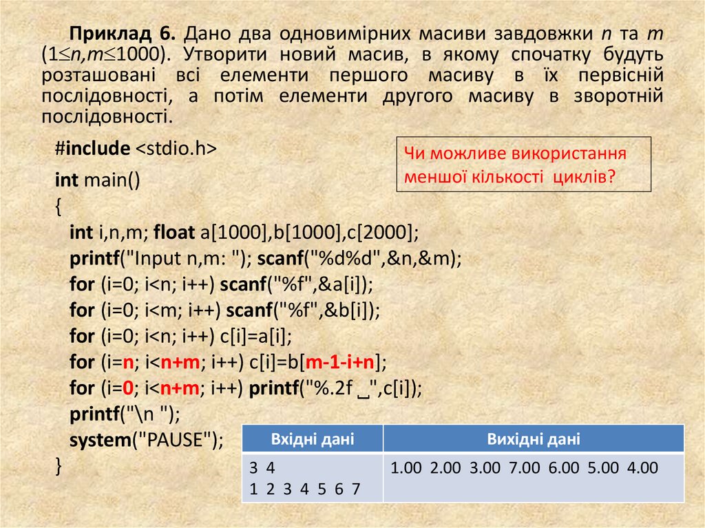 Приклад 6. Дано два одновимірних масиви завдовжки n та m(1 n,m 1000). Утворити новий масив, в якому спочатку будуть