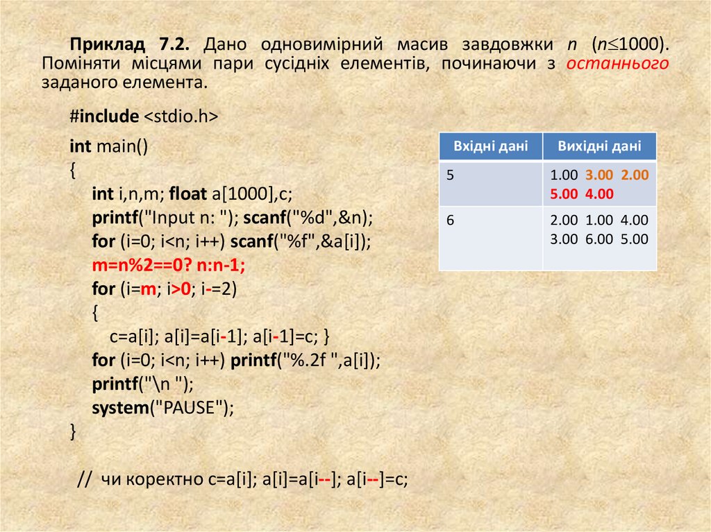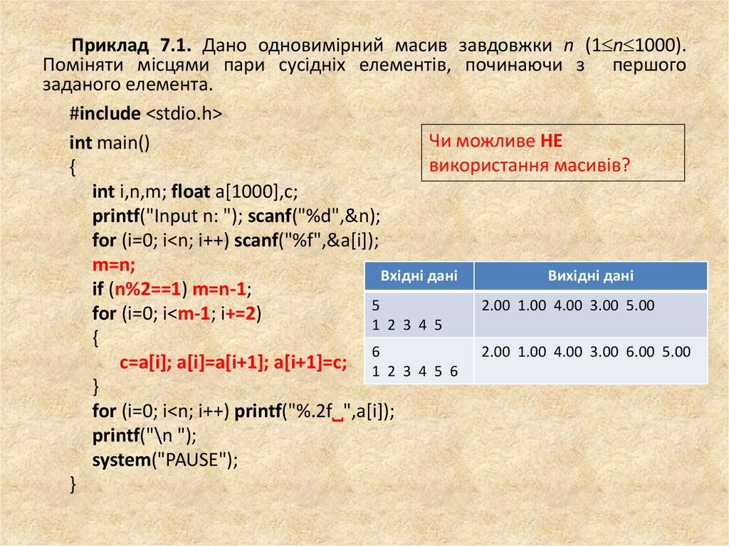 Приклад 7.2. Дано одновимірний масив завдовжки n (n 1000).Поміняти місцями пари сусідніх елементів, починаючи з останнього
