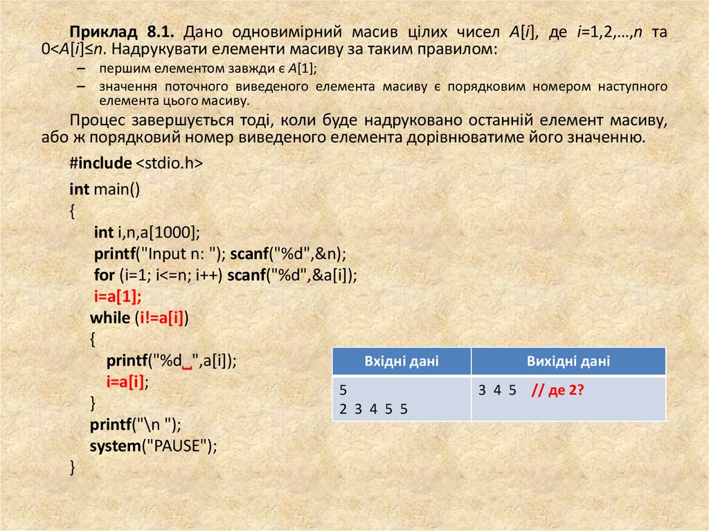 Приклад 8.1. Дано одновимірний масив цілих чисел A[i], де i=1,2,…,n та0<A[i]≤n. Надрукувати елементи масиву за таким правилом: