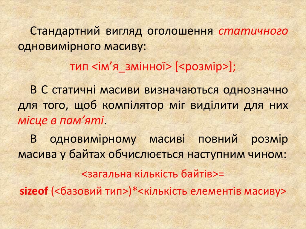 Стандартний вигляд оголошення статичногоодновимірного масиву: