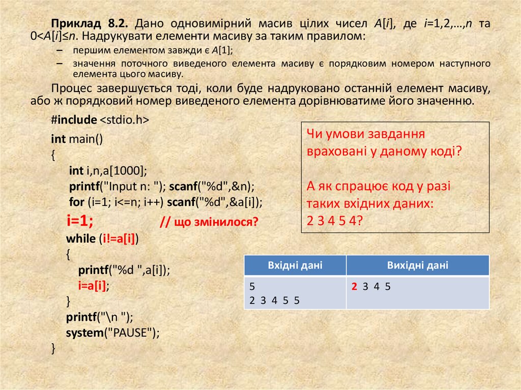 Приклад 8.2. Дано одновимірний масив цілих чисел A[i], де i=1,2,…,n та0<A[i]≤n. Надрукувати елементи масиву за таким правилом: