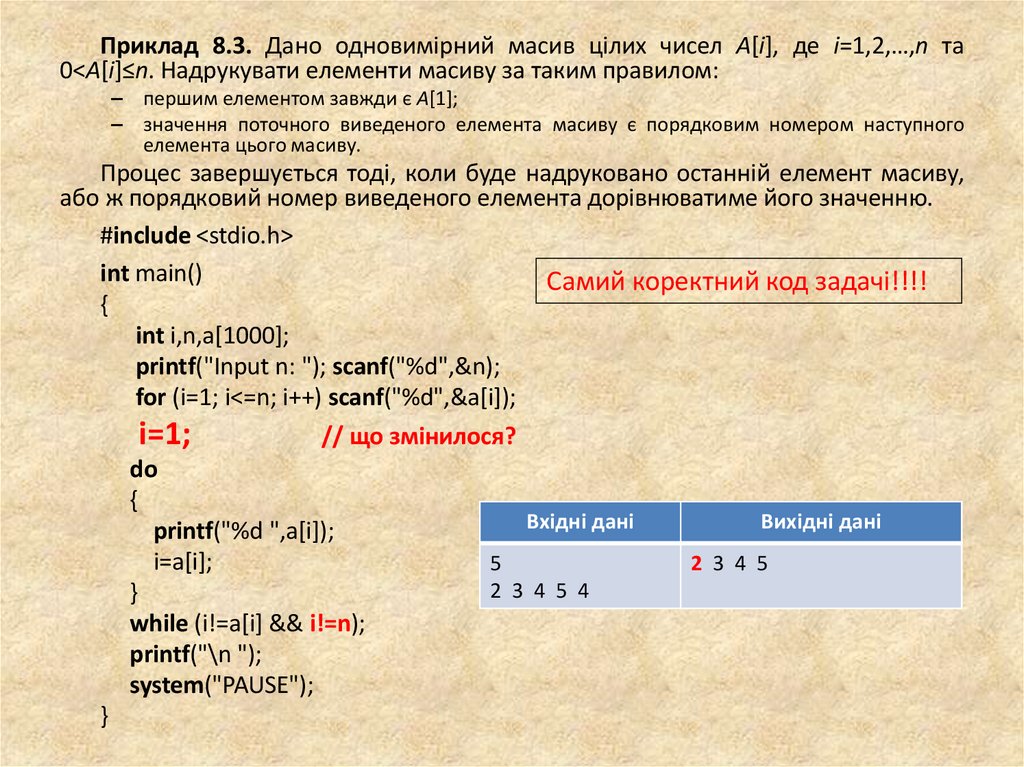 Приклад 8.3. Дано одновимірний масив цілих чисел A[i], де i=1,2,…,n та0<A[i]≤n. Надрукувати елементи масиву за таким правилом: