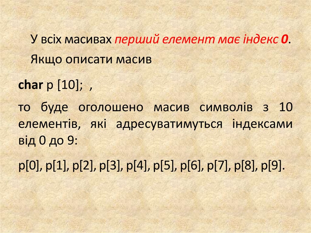 У всіх масивах перший елемент має індекс 0.Якщо описати масив