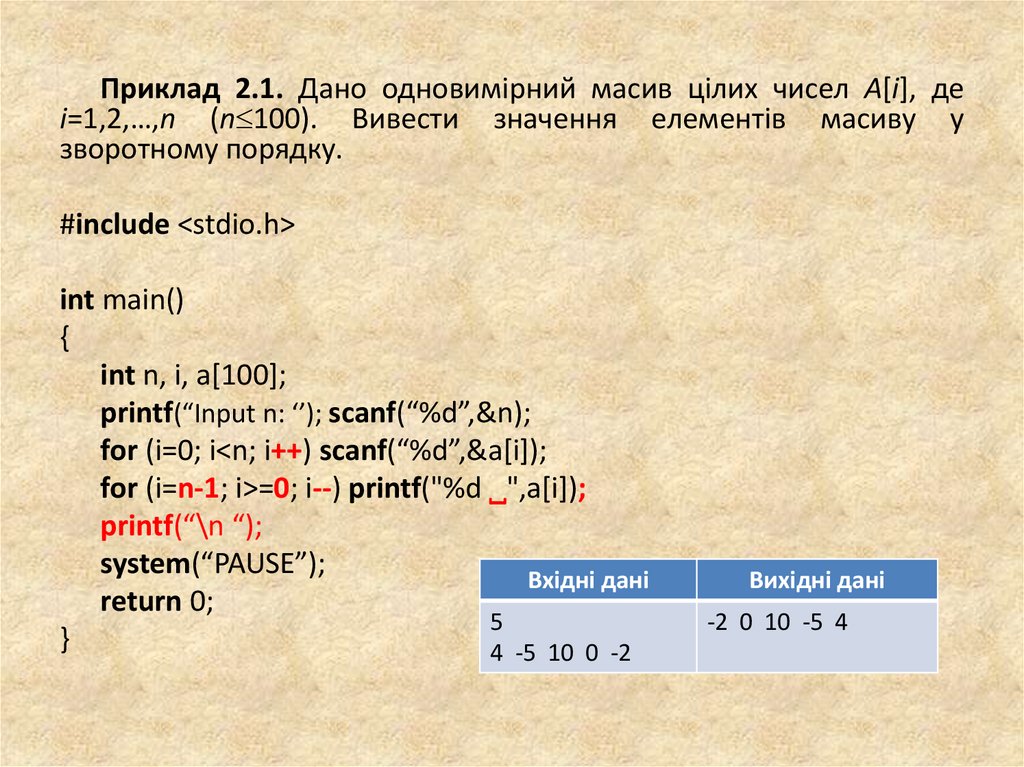Приклад 2.1. Дано одновимірний масив цілих чисел A[i], деi=1,2,…,n (n 100). Вивести значення елементів масиву у