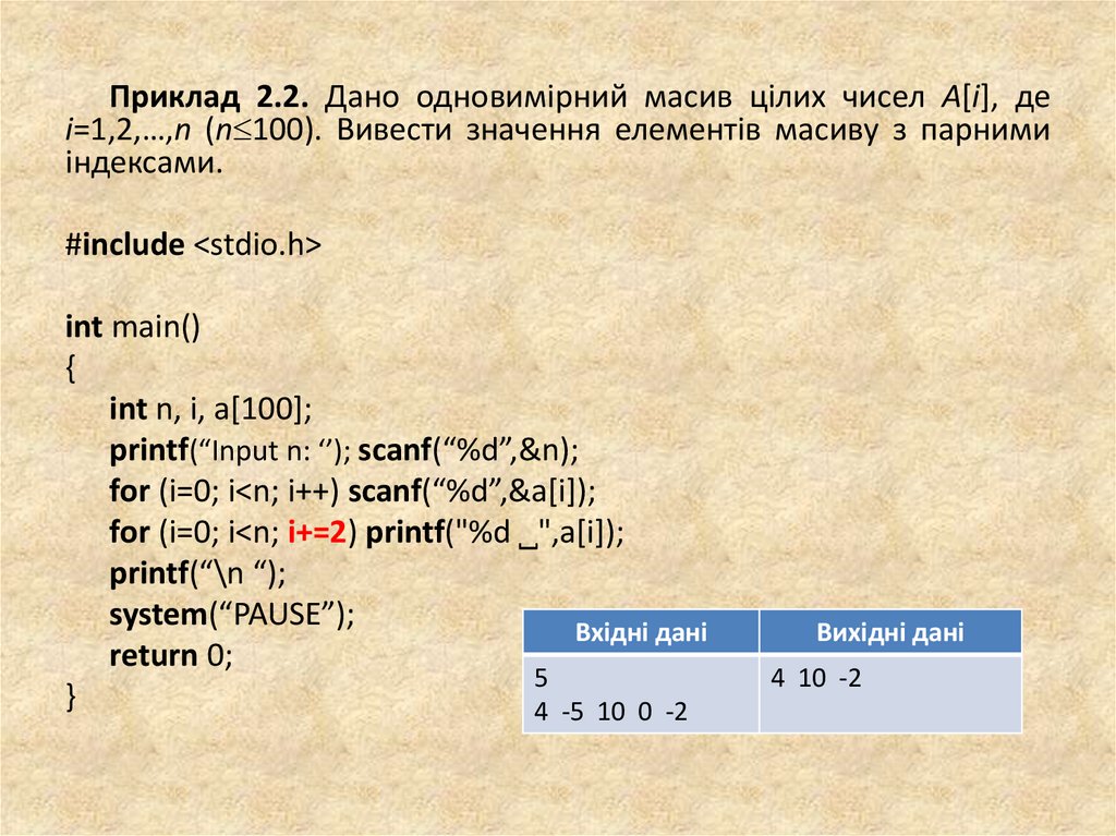 Приклад 2.2. Дано одновимірний масив цілих чисел A[i], деi=1,2,…,n (n 100). Вивести значення елементів масиву з парними