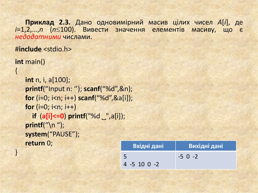 Приклад 2.3. Дано одновимірний масив цілих чисел A[i], деi=1,2,…,n (n 100). Вивести значення елементів масиву, що є