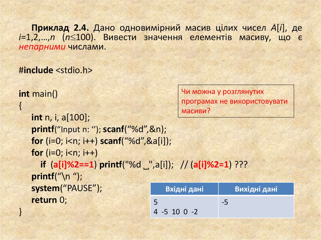 Приклад 2.4. Дано одновимірний масив цілих чисел A[i], деi=1,2,…,n (n 100). Вивести значення елементів масиву, що є
