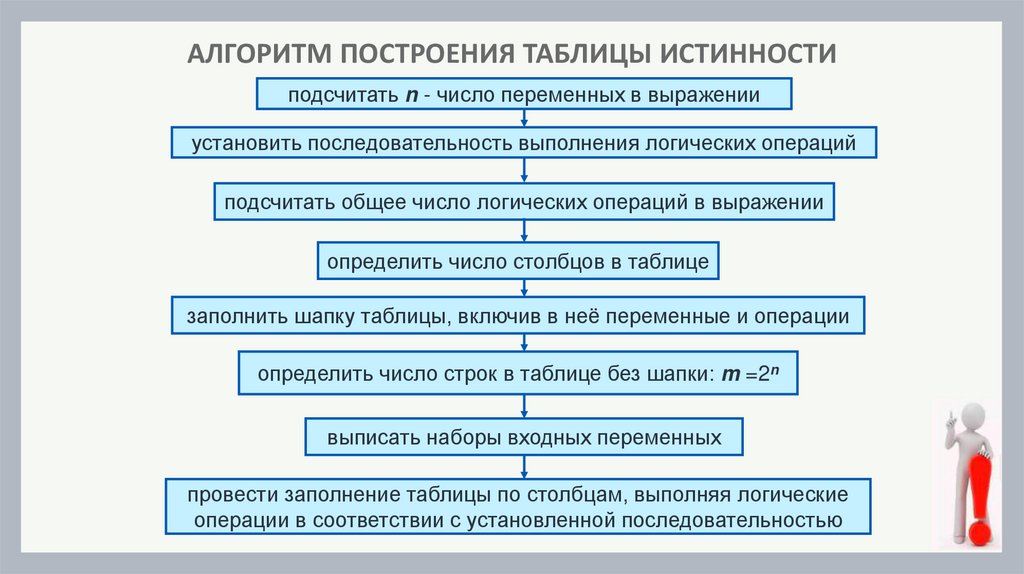 АЛГОРИТМ ПОСТРОЕНИЯ ТАБЛИЦЫ ИСТИННОСТИподсчитать n - число переменных в выражении