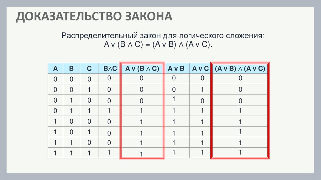 ДОКАЗАТЕЛЬСТВО ЗАКОНАРаспределительный закон для логического сложения: