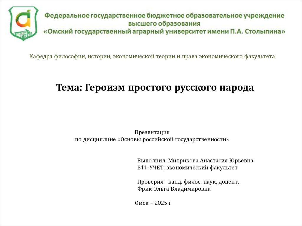 Кафедра философии, истории, экономической теории и права экономического факультетаТема: Героизм простого русского народа