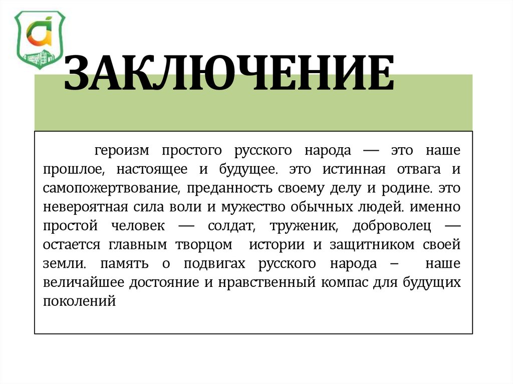 ЗАКЛЮЧЕНИЕгероизм простого русского народа — это наше