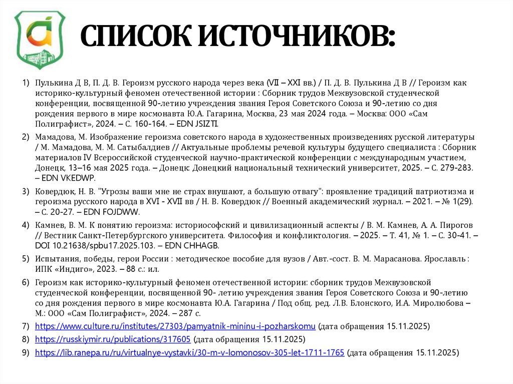 СПИСОК ИСТОЧНИКОВ:1) Пулькина Д В, П. Д. В. Героизм русского народа через века (VII – XXI вв.) / П. Д. В. Пулькина Д В // Героизм как