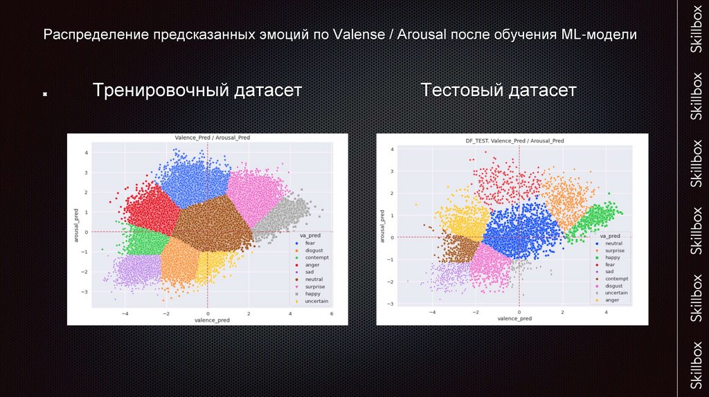 Распределение предсказанных эмоций по Valense / Arousal после обучения ML-моделиТренировочный датасет
