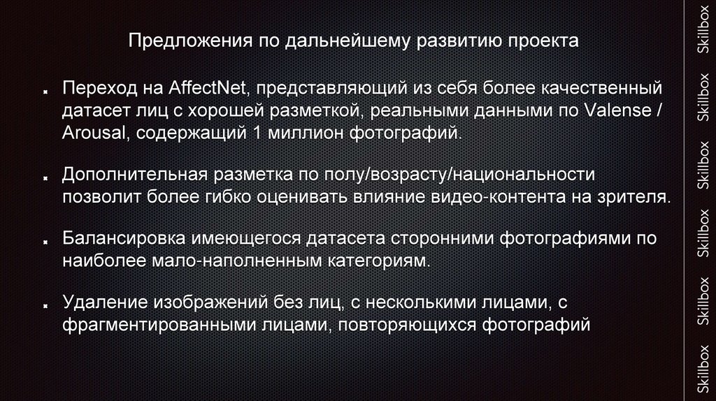 Предложения по дальнейшему развитию проектаПереход на AffectNet, представляющий из себя более качественный