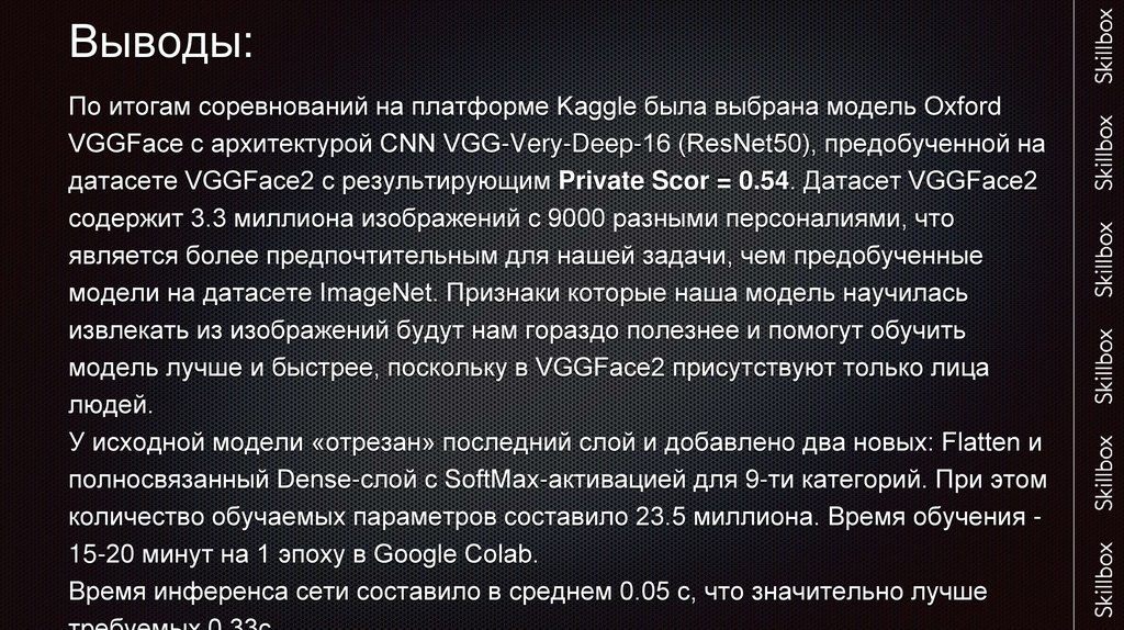 Выводы:По итогам соревнований на платформе Kaggle была выбрана модель Oxford
