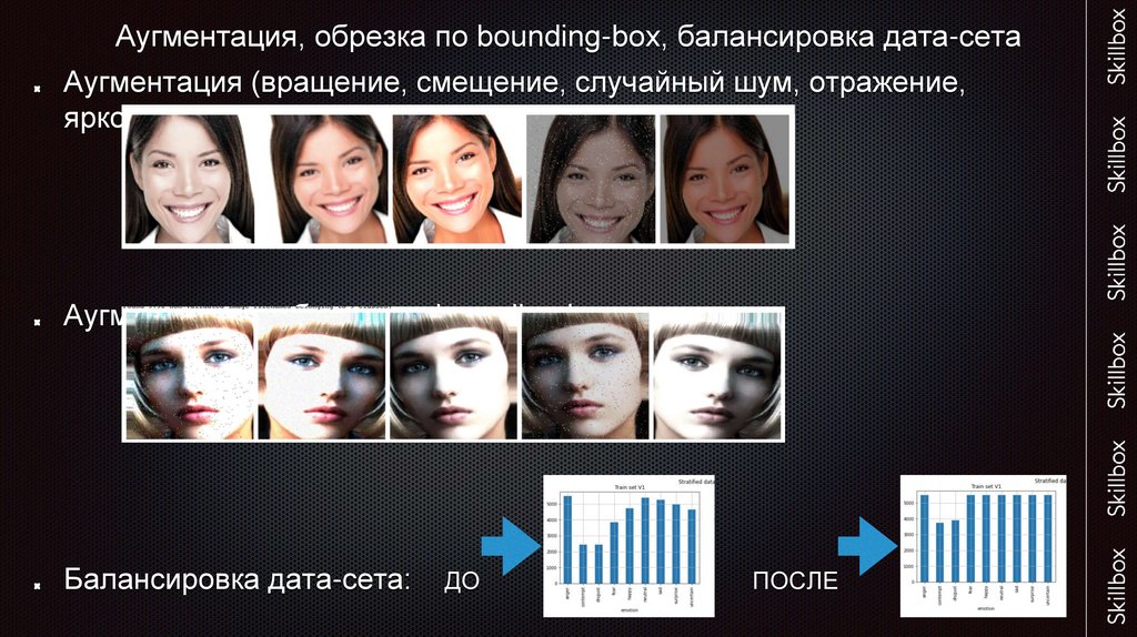 Аугментация, обрезка по bounding-box, балансировка дата-сетаАугментация (вращение, смещение, случайный шум, отражение,