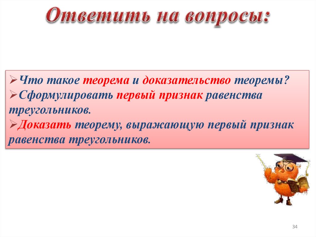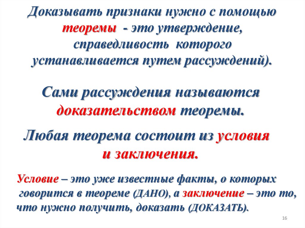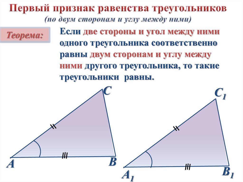 Что такое теорема и доказательство теоремы?Сформулировать первый признак равенства