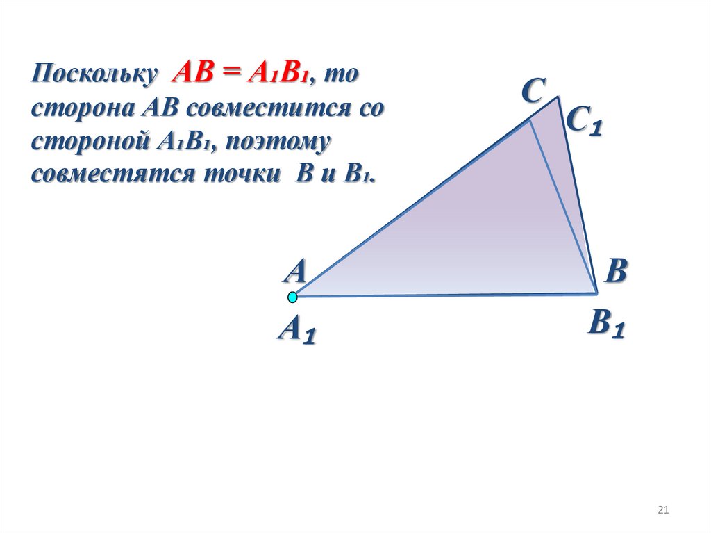 Поскольку АВ = А₁В₁, тосторона АВ совместится со
