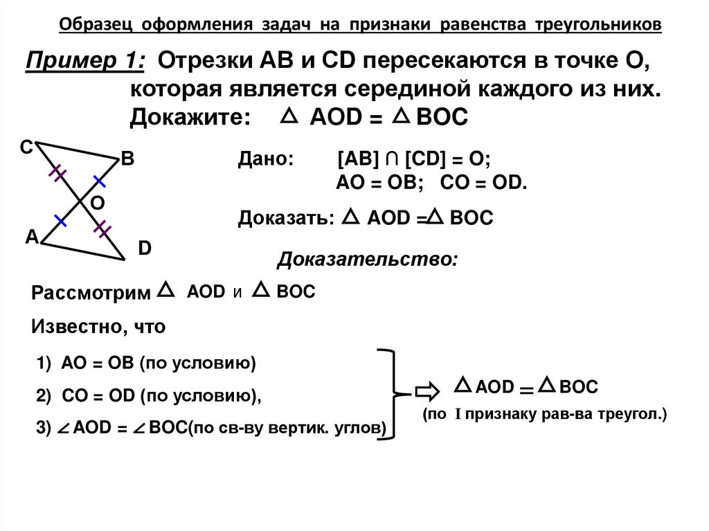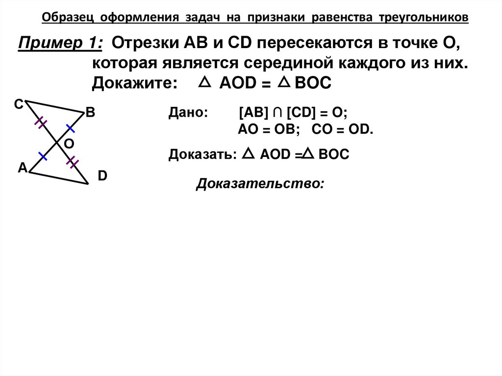 Образец оформления задач на признаки равенства треугольниковПример 1: Отрезки АВ и СD пересекаются в точке О,
