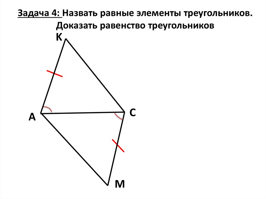 Задача 4: Назвать равные элементы треугольников.Доказать равенство треугольников
