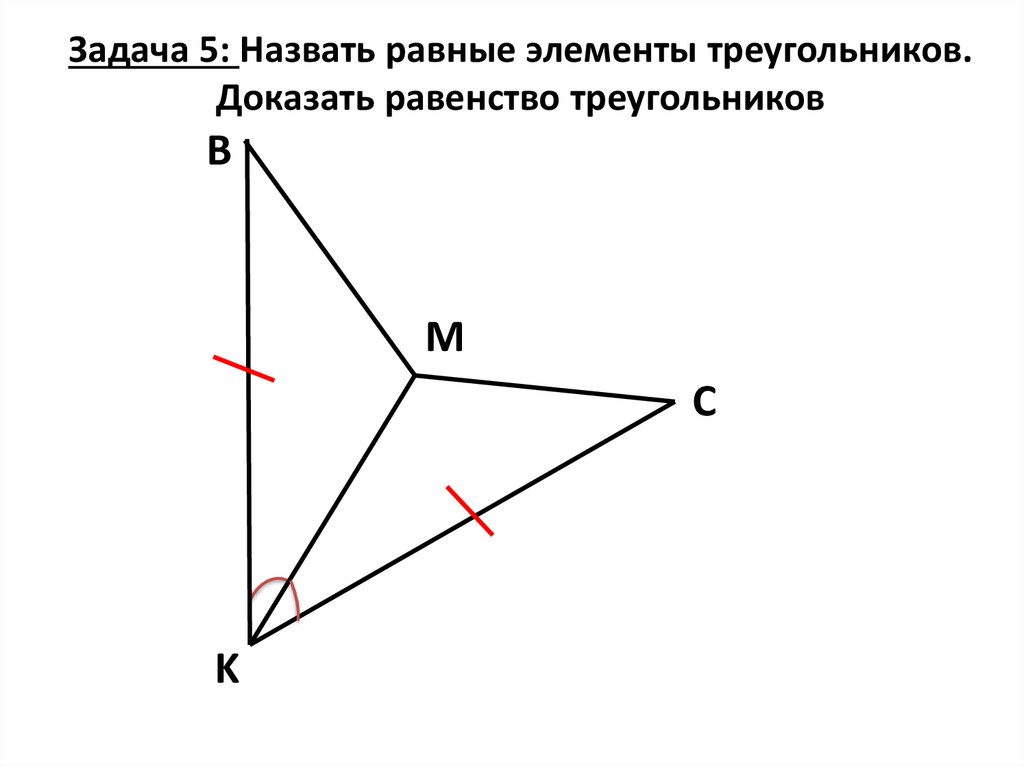Задача 5: Назвать равные элементы треугольников.Доказать равенство треугольников