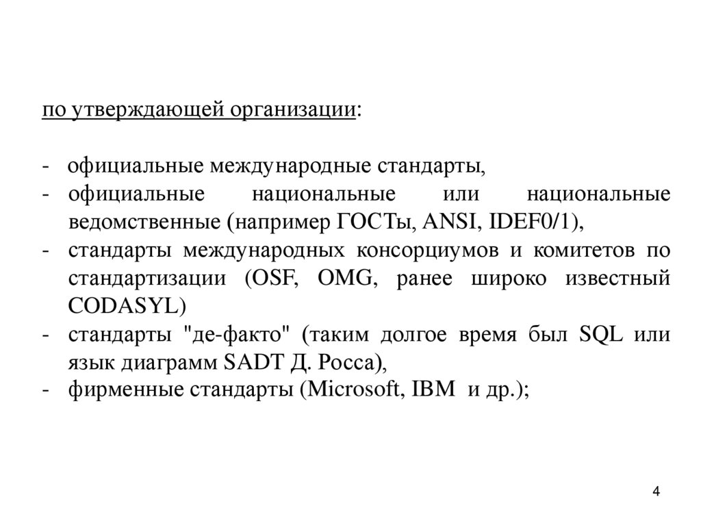 ведомственные (например ГОСТы, ANSI, IDEF0/1),