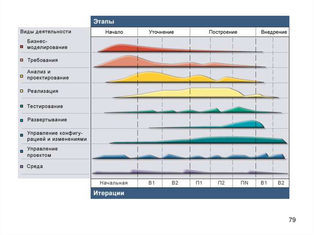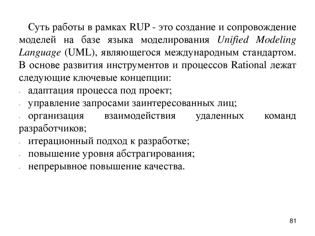 Суть работы в рамках RUP - это создание и сопровождениемоделей на базе языка моделирования Unified Modeling