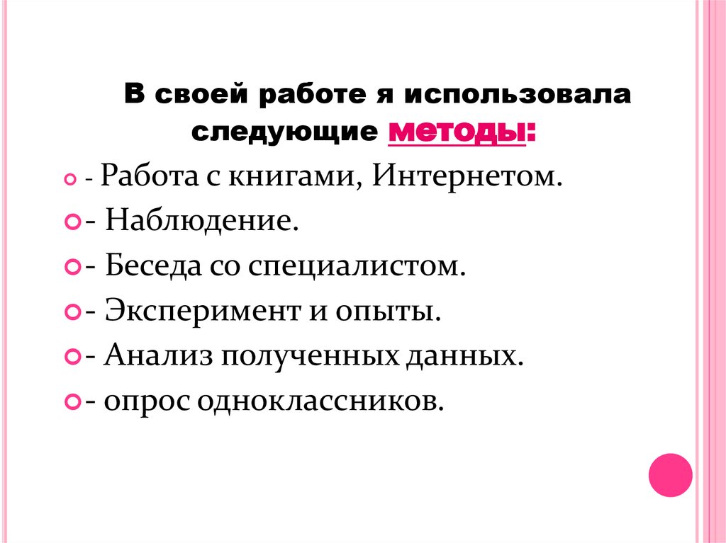 В своей работе я использоваласледующие методы: