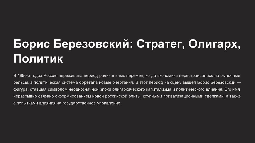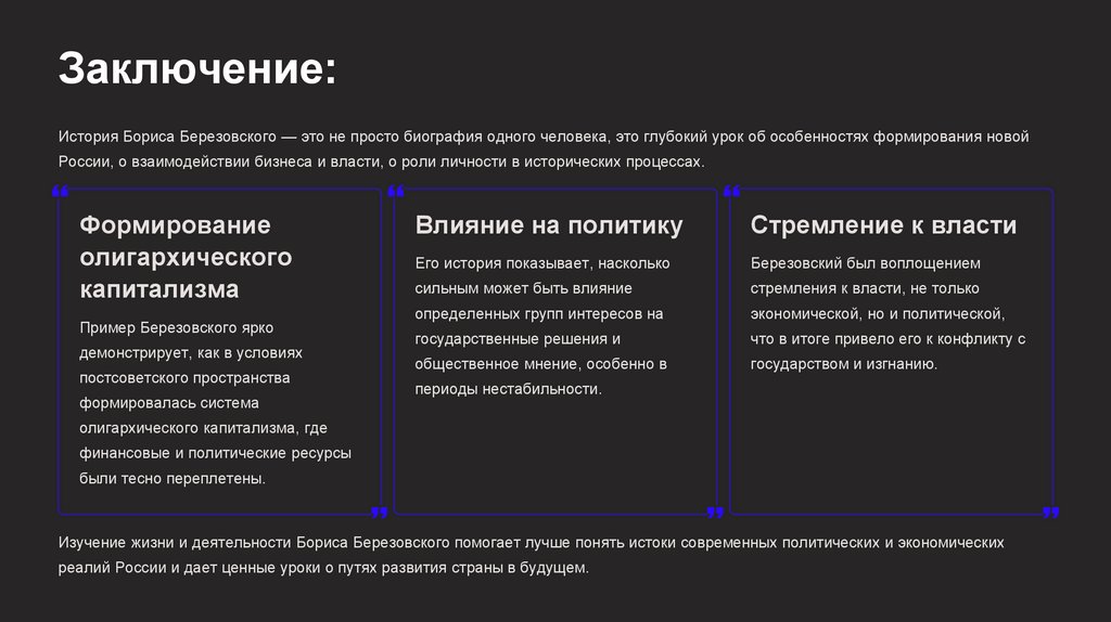 Заключение:История Бориса Березовского — это не просто биография одного человека, это глубокий урок об особенностях формирования новой