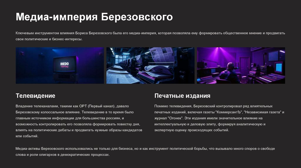 Медиа-империя БерезовскогоКлючевым инструментом влияния Бориса Березовского была его медиа-империя, которая позволяла ему формировать общественное мнение и продвигать