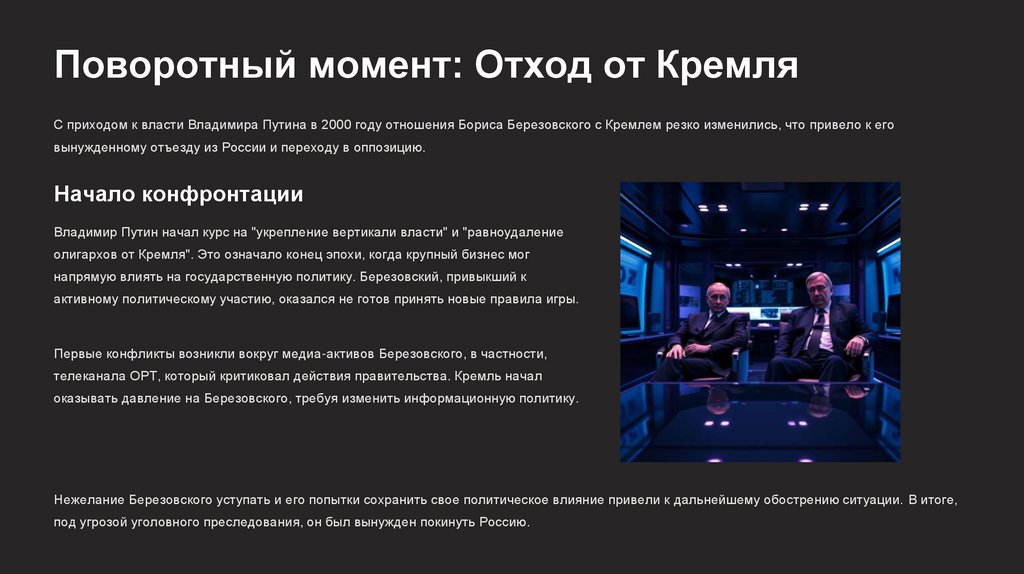 Поворотный момент: Отход от КремляС приходом к власти Владимира Путина в 2000 году отношения Бориса Березовского с Кремлем резко изменились, что привело к его