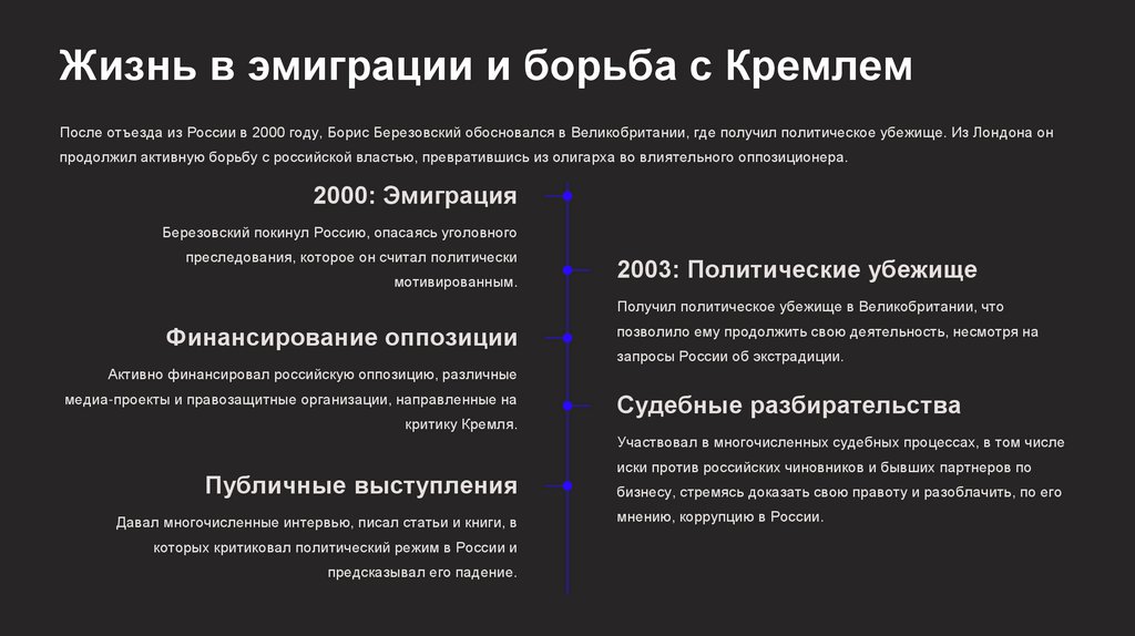 Жизнь в эмиграции и борьба с КремлемПосле отъезда из России в 2000 году, Борис Березовский обосновался в Великобритании, где получил политическое убежище. Из Лондона он