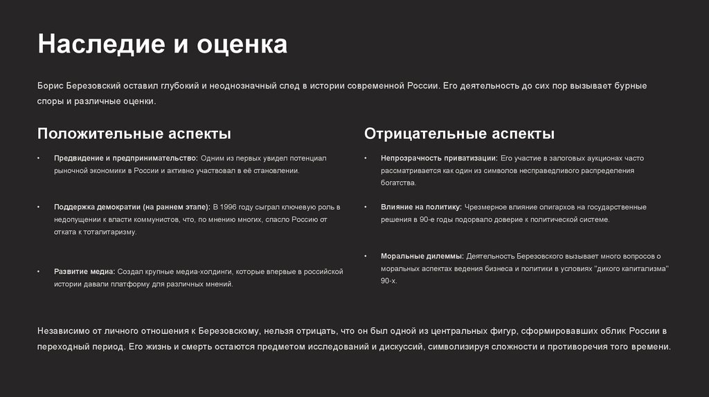 Наследие и оценкаБорис Березовский оставил глубокий и неоднозначный след в истории современной России. Его деятельность до сих пор вызывает бурные