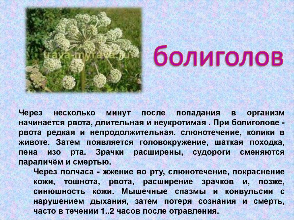 Через несколько минут после попадания в организмначинается рвота, длительная и неукротимая . При болиголове рвота редкая и непродолжительная. слюнотечение, колики в