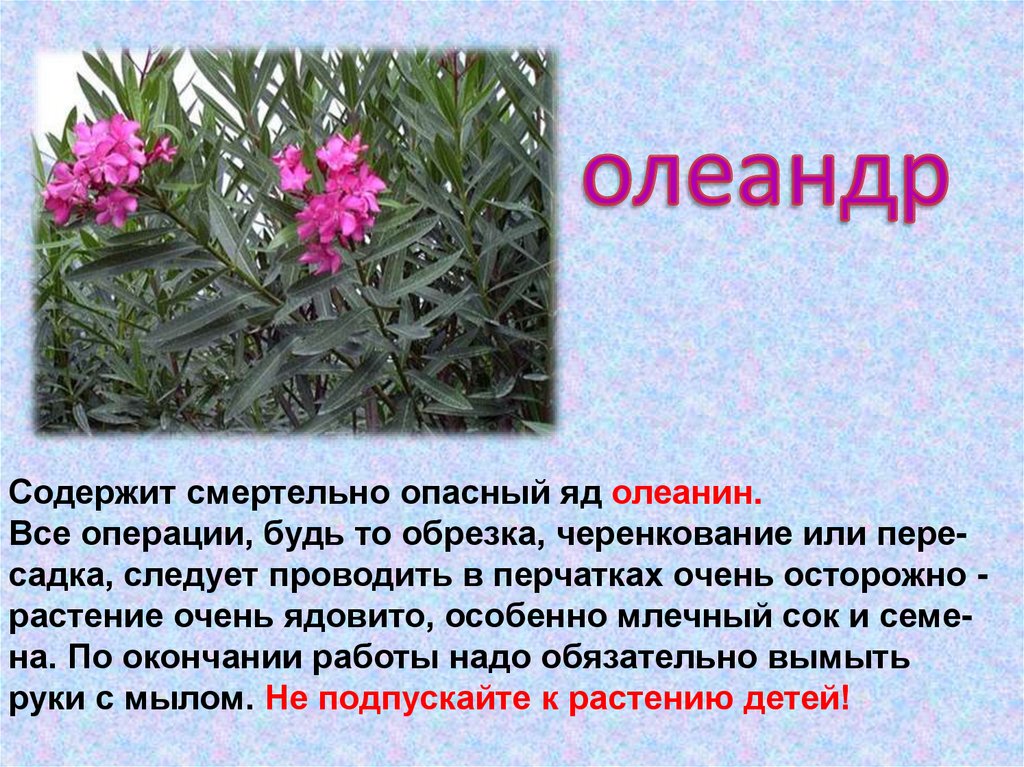 Содержит смертельно опасный яд олеанин.Все операции, будь то обрезка, черенкование или пересадка, следует проводить в перчатках очень осторожно растение очень ядовито, особенно млечный сок и семена. По окончании работы надо обязательно вымыть