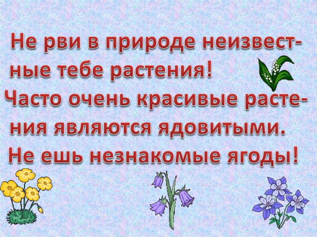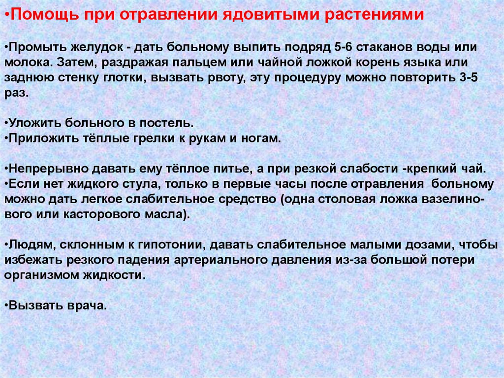 •Помощь при отравлении ядовитыми растениями•Промыть желудок - дать больному выпить подряд 5-6 стаканов воды или