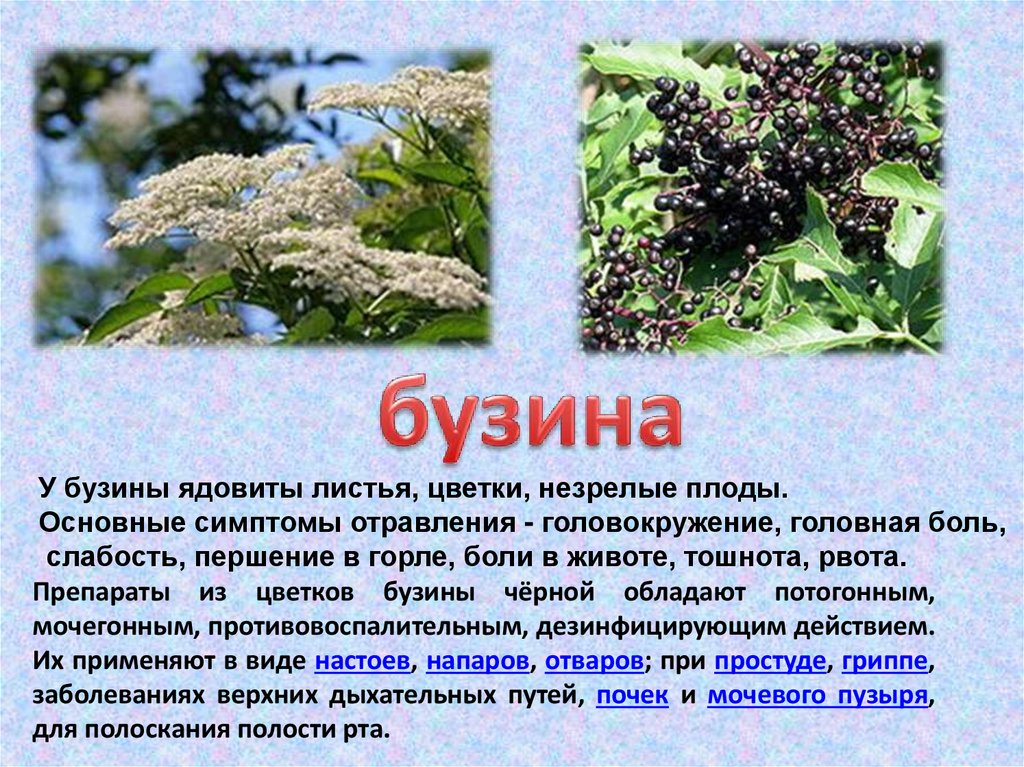 У бузины ядовиты листья, цветки, незрелые плоды.Основные симптомы отравления - головокружение, головная боль,