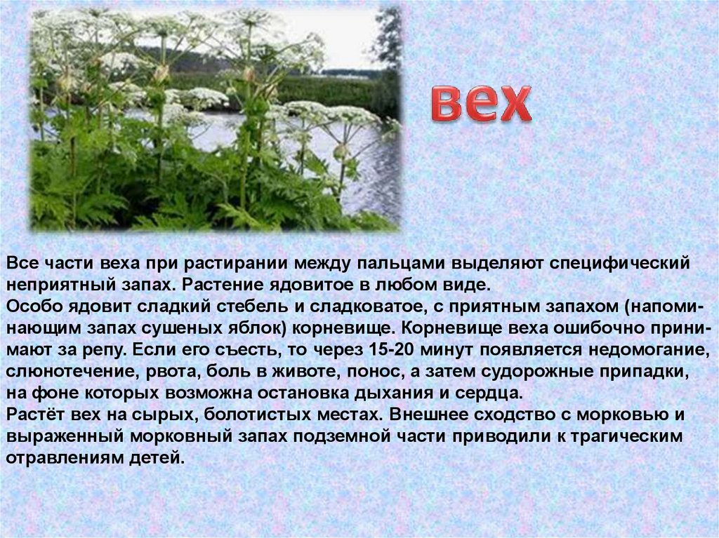 Все части веха при растирании между пальцами выделяют специфическийнеприятный запах. Растение ядовитое в любом виде.