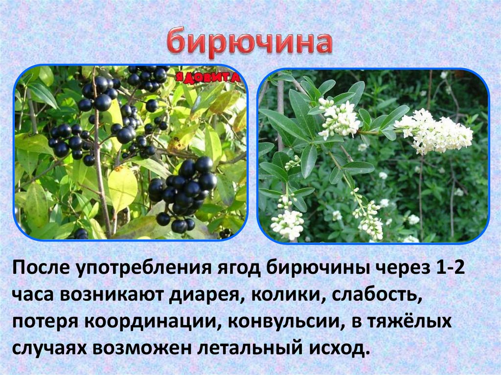 После употребления ягод бирючины через 1-2часа возникают диарея, колики, слабость,