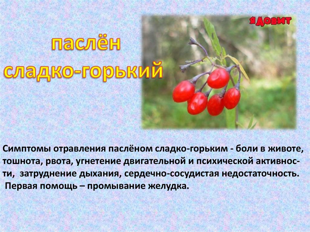 Симптомы отравления паслёном сладко-горьким - боли в животе,тошнота, рвота, угнетение двигательной и психической активности, затруднение дыхания, сердечно-сосудистая недостаточность.