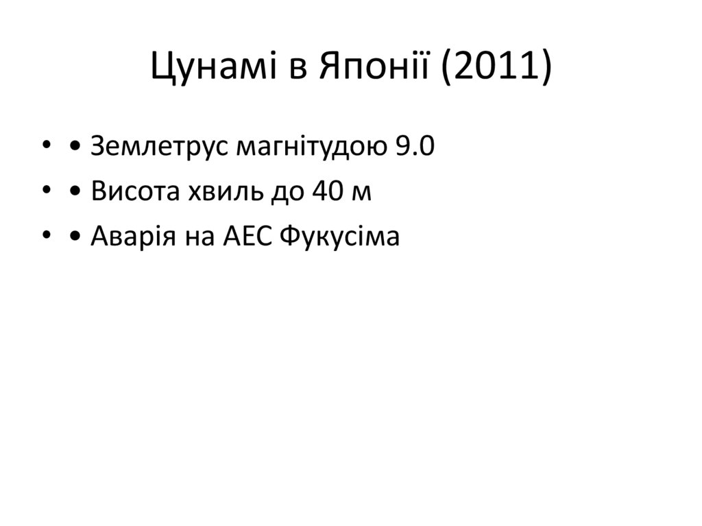 Цунамі в Японії (2011)• • Землетрус магнітудою 9.0