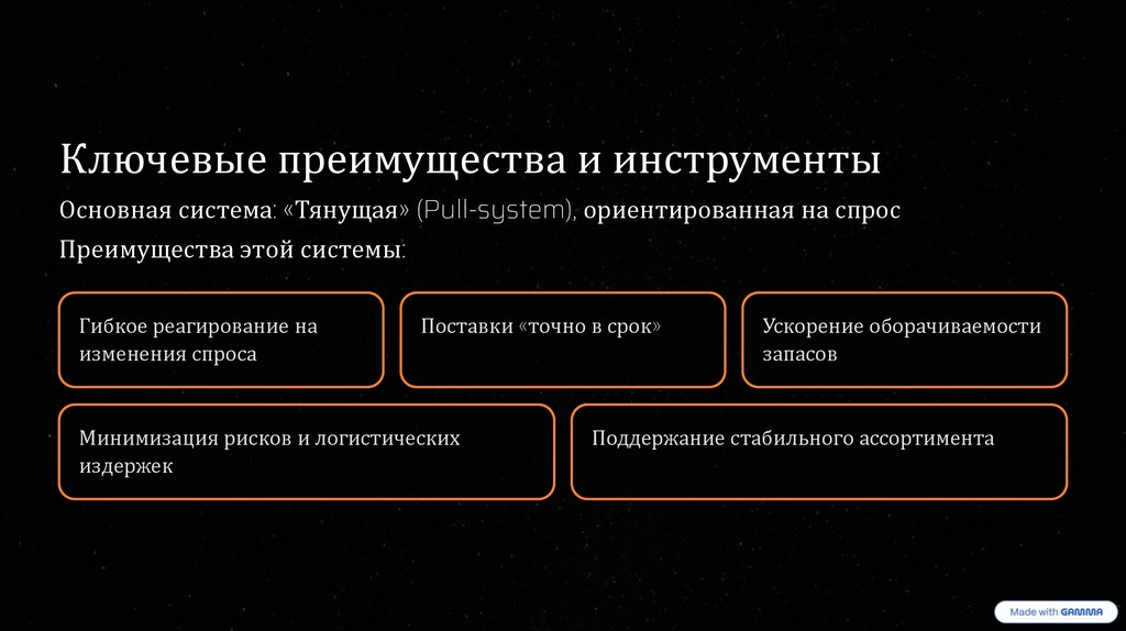 Ключевые преимущества и инструментыОсновная система: «Тянущая» (Pull-system), ориентированная на спрос