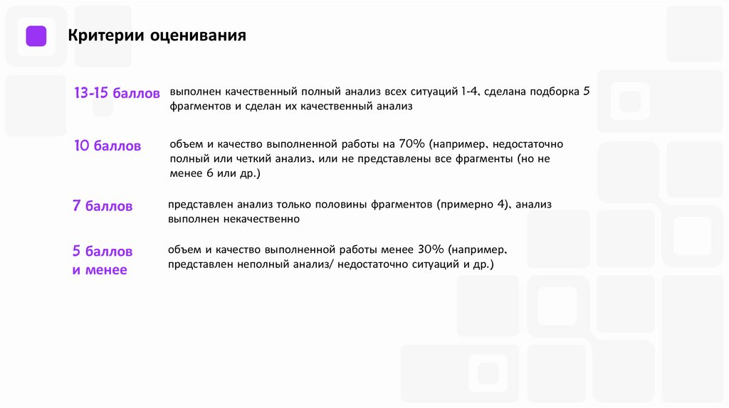 Критерии оценивания13-15 баллов выполнен качественный полный анализ всех ситуаций 1-4, сделана подборка 5