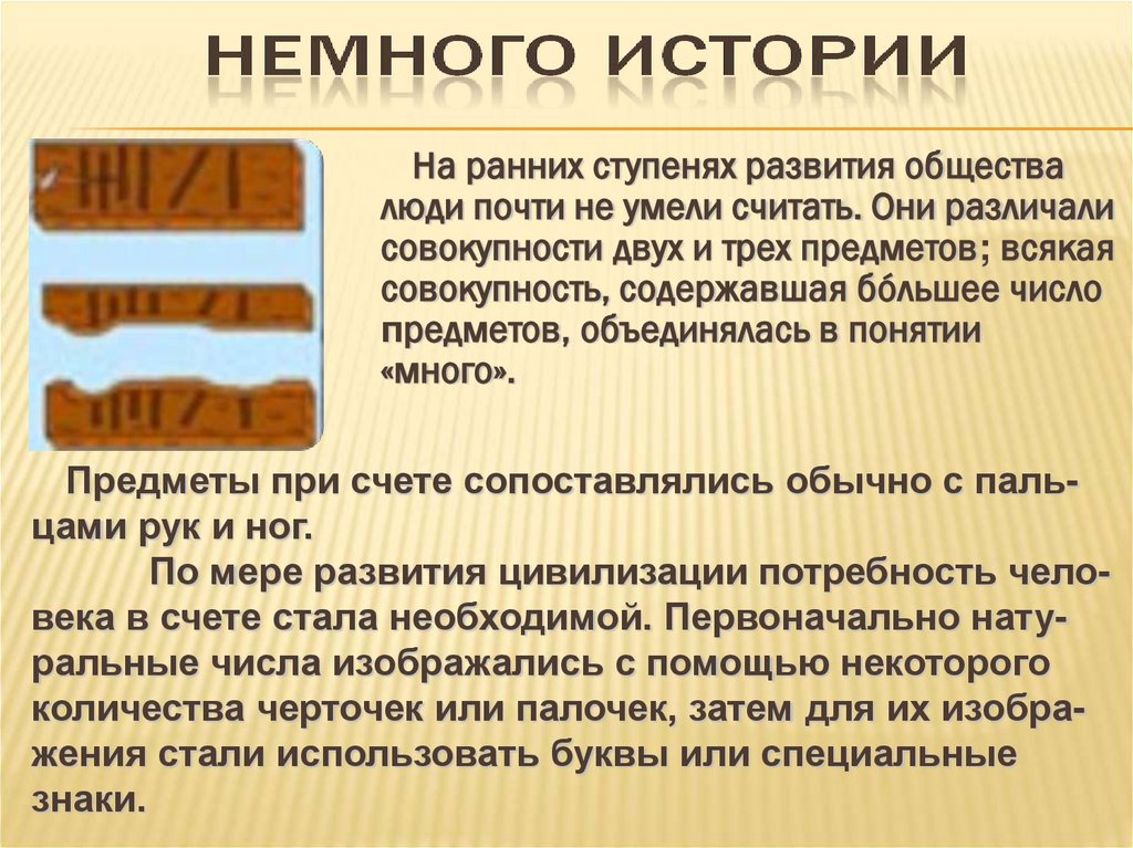 По мере развития цивилизации потребность человека в счете стала необходимой. Первоначально натуральные числа изображались с помощью некоторого