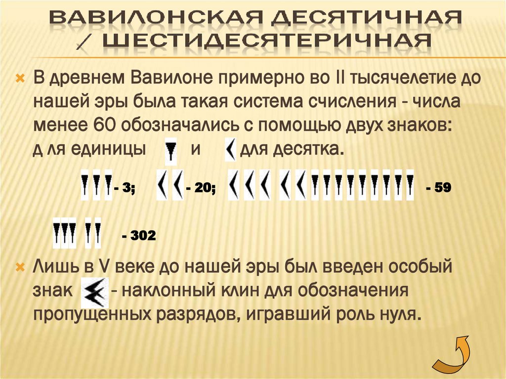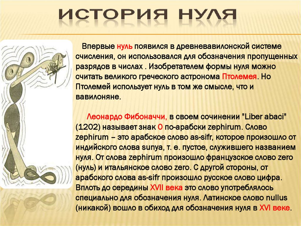 Впервые нуль появился в древневавилонской системесчисления, он использовался для обозначения пропущенных