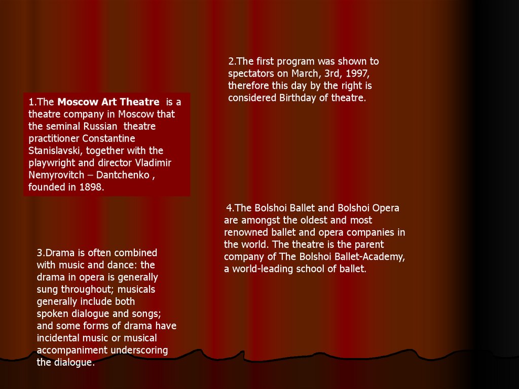 1.The Moscow Art Theatre is atheatre company in Moscow that