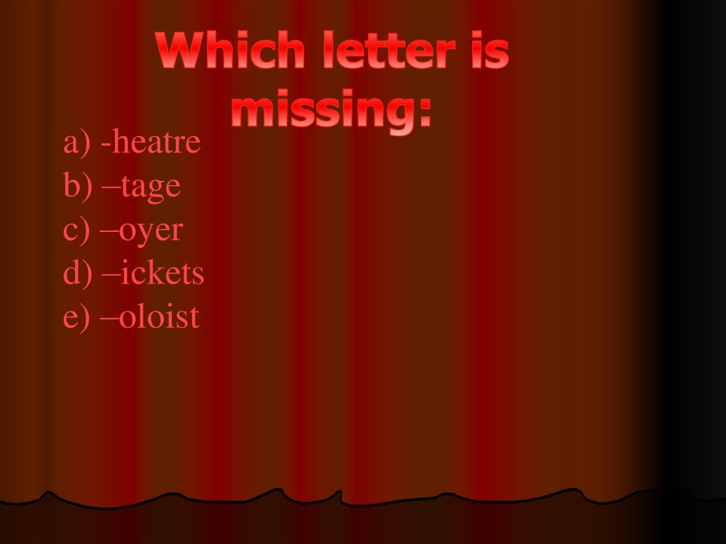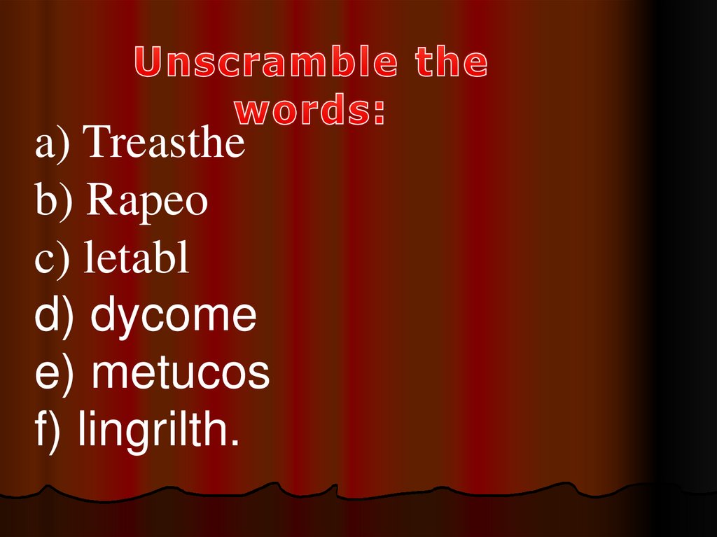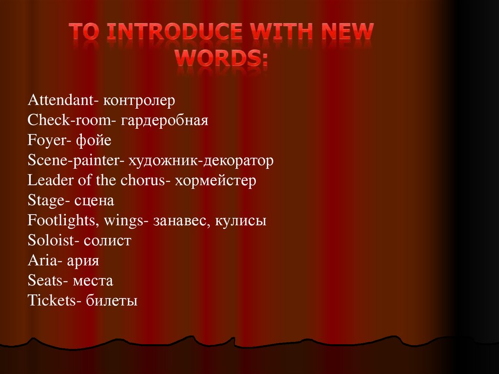 Footlights, wings- занавес, кулисы