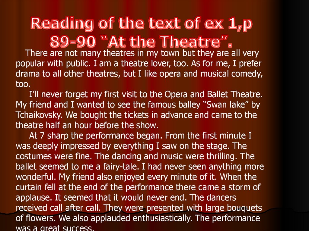 There are not many theatres in my town but they are all verypopular with public. I am a theatre lover, too. As for me, I prefer