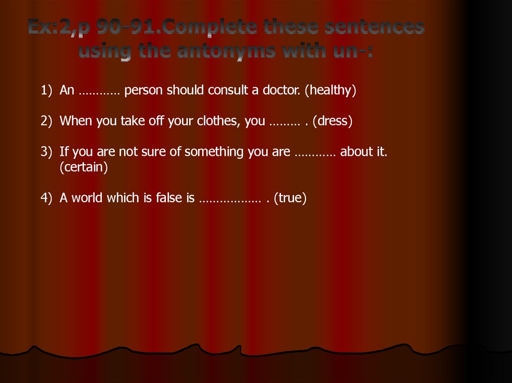 1) An ………… person should consult a doctor. (healthy)2) When you take off your clothes, you ……… . (dress)