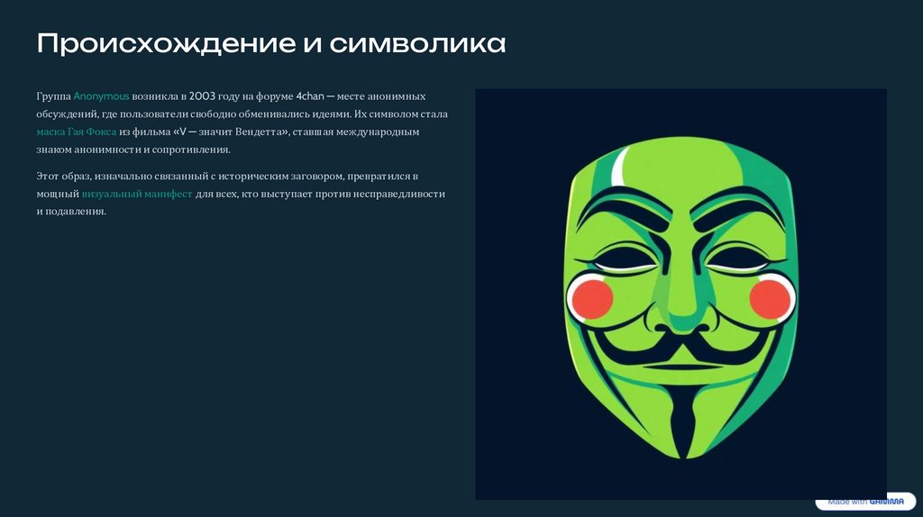 Происхождение и символикаГруппа Anonymous возникла в 2003 году на форуме 4chan — месте анонимных
